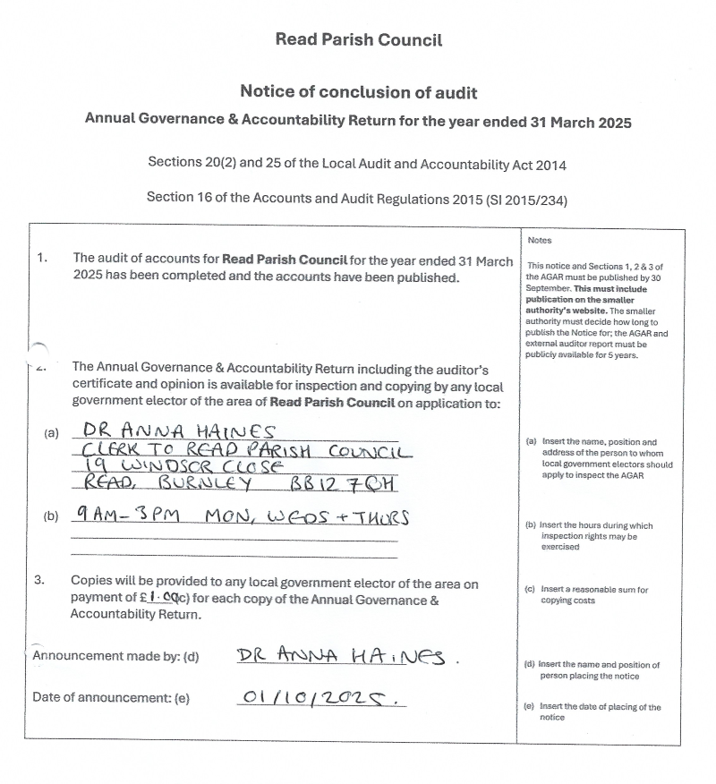 Read is in the Ribble Valley Parliamentary Constituency (Ribble Valley North East County Electoral Division). There are approximately 600 houses and 1160 electors on the Register of Electors. The population figure is estimated at c.1500.